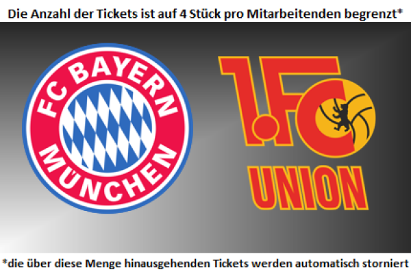 | Wichtige Informationen | Dieses Ticket ist keine offizielle Eintrittskarte und dient ausschließlich zur Abholung der offiziellen Tickets für das FC Bayern Heimspiel. Der Weiterverkauf der offiziellen Tickets ist nicht zulässig ! Der Umtausch oder die Rückgabe gekaufter Tickets ist nicht möglich. BEACHTEN SIE FOLGENDE ABHOLZEITEN: Gültig nur für Mitarbeitende der AUDI AG und deren |